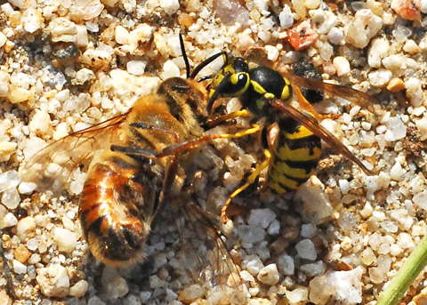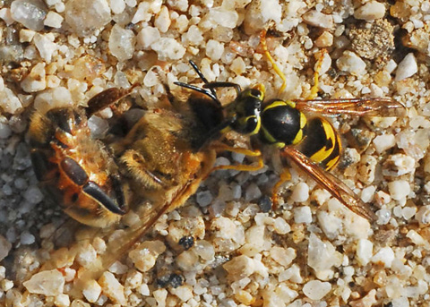 Western yellow jacket and a drone honey bee. Honey bees had nested in a sprinkler vault, under encelia and adjacent to a trail near the Arboretum's Potting Shed store. Some bees had fallen onto the trail, apparently near death. Hovering near the ground, the yellow jacket investigated the soon-to-be corpses, then selected a drone honey bee. It landed next to the bee and put its mouth to the bee's mouth. What was happening? Bug Guide Contributing Editor Harsi Parker notes "the mouth is the preferred method of dragging off honey bees. I've got some photos of an impressively small ant attempting the same maneuver with a near-dead bee. My guess would be, it's the point furthest from the stinger, eh?" Another contributor then noted "I think one reason the mouth parts are attractive to the scavenging Yellowjacket is that the dying drone wqas regurgitating some Honey from its crop." |