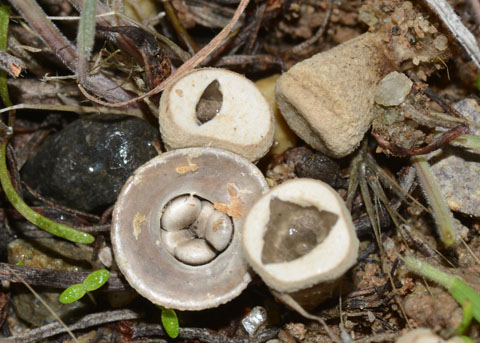 Bird's Nest Fungus Cyathus olla This tiny fungus shows an amazing "Splash-cup" dispersal mechanism. The "eggs", properly named peridioles, are spring-loaded, and when disturbed by a raindrop they are propelled out of the cup (peridium) to land up to 3-4 feet away. They trail a sticky ball (hapteron) on the end of a string (funiculum) which may be up to 8 inches long, allowing them to stick to nearby plant stems (Story; Illustration). They then release their cargo of spores that germinate and grow into "homokaryotic hyphae", which can fuse with other hyphae to form a "dikaryotic mycelium", and this can later produce new peridia (Life cycle). Family: Nidulariaceae Back to Fungi of Orange County, California |