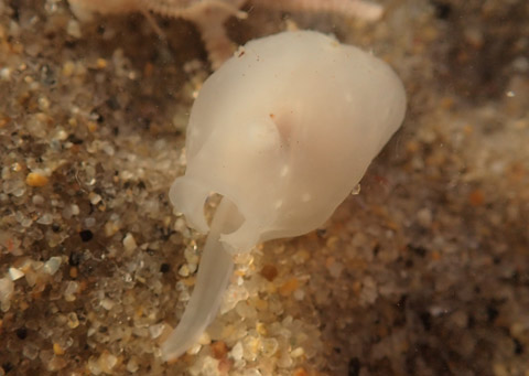 Internally-shelled clam Chlamydoconcha orcutti The long narrow foot is protruded from the mantle cavity and used to drag the clam along. The mantle is enlarged to completely cover the long narrow valves, which can be seen faintly inside it, and there are papillations on the mostly smooth external surface of the mantle. Identified by Don Cadien Back to Molluscs of Southern California |