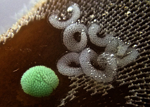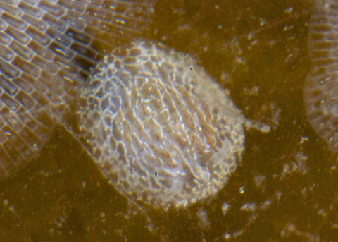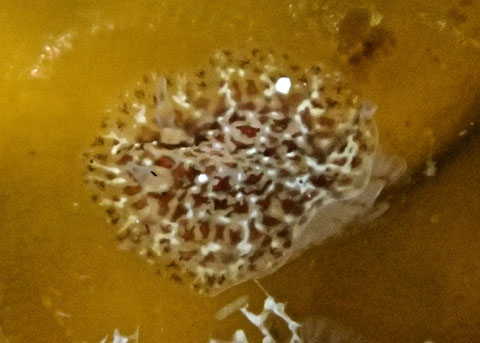 ![]() On bryozoan Membranipora. Eggs on the right. Unknown eggs on the left. Shaw's Cove, Laguna Beach, Orange County, CA. 3/2/2018. © Rex Barnard |