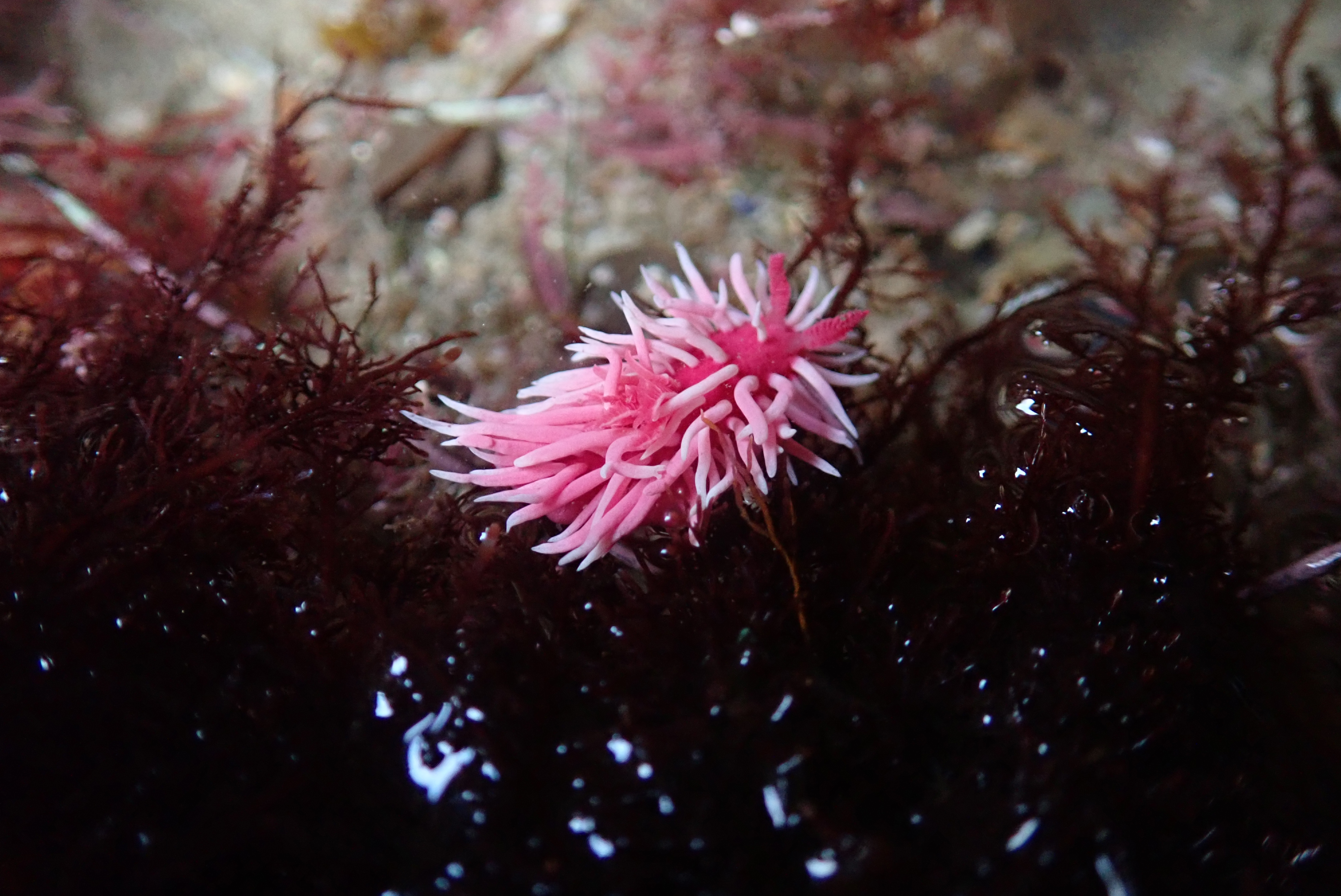 Hopkin's Rose Okenia rosacea Nudibranchiata: Goniodorididae Feeds exclusively on Rosy Bryozoan, Integripelta bilabiata Video - right side up. Reef Point Crystal Cove State Park. 2/9/16. © Timothy Arehart Video - upside down. Reef Point Crystal Cove State Park. 2/9/16. © Tim Arehart A Pretty Pink Nudibranch Moves North, and It’s a ‘Canary in the Tidepool’ Back to Molluscs of Southern California |