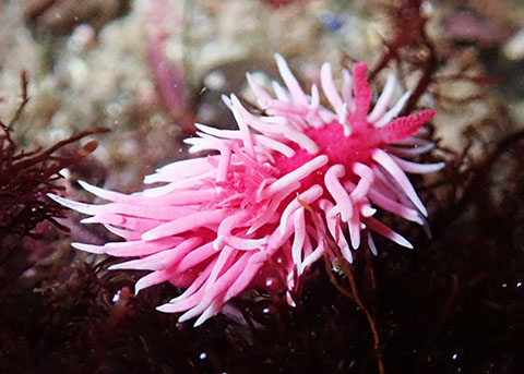 Hopkin's Rose Okenia rosacea Nudibranchiata: Goniodorididae Feeds exclusively on Rosy Bryozoan, Integripelta bilabiata Video - right side up. Reef Point Crystal Cove State Park. 2/9/16. © Timothy Arehart Video - upside down. Reef Point Crystal Cove State Park. 2/9/16. © Tim Arehart A Pretty Pink Nudibranch Moves North, and It’s a ‘Canary in the Tidepool’ Back to Molluscs of Southern California |