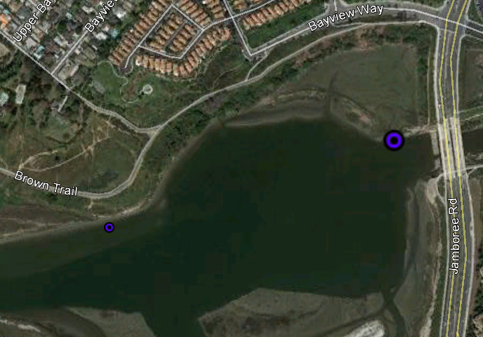 | Distribution in Newport Bay, Newport Beach, Orange County, CA. 2012. Large circles, >5/cu.ft.; small circles, <5/cu.ft.: | |