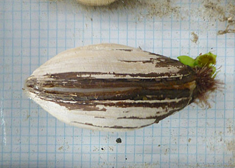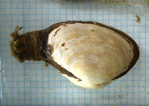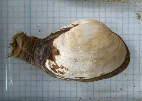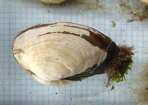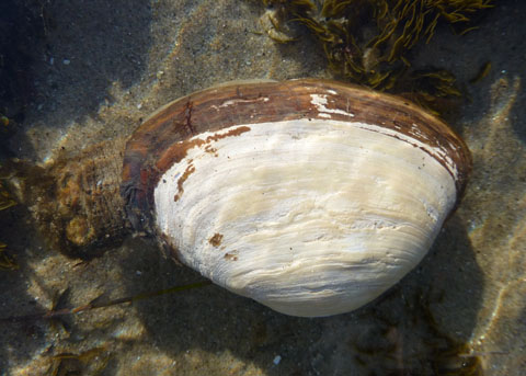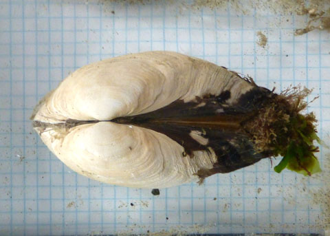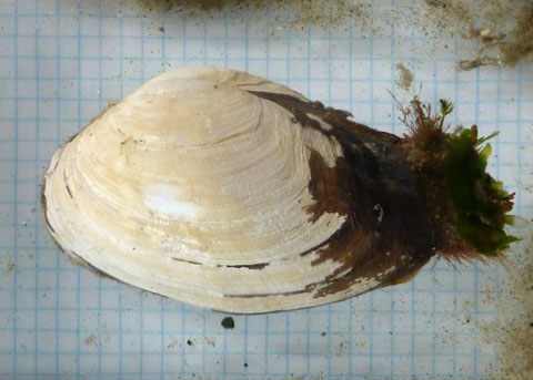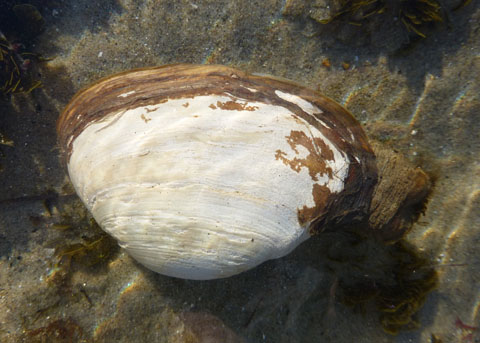 ![]() The siphons (on the left, partly obscured by algal growth) cannot be completely withdrawn into the shell. |