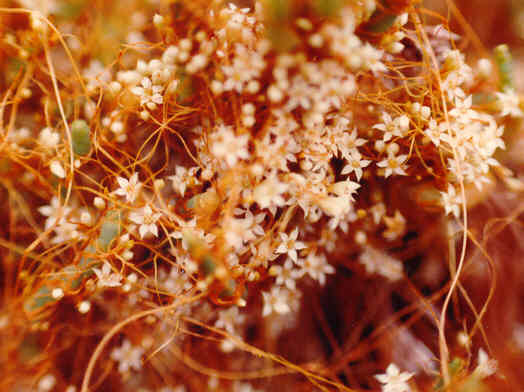 with bright orange stems and small white flowers. It can be very dense, but the effect on the host plants does