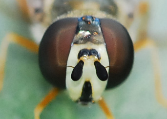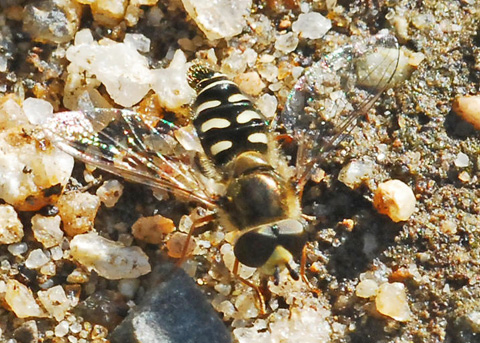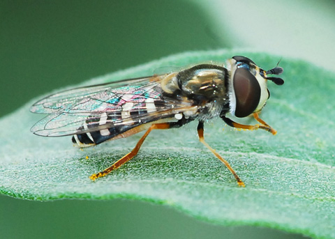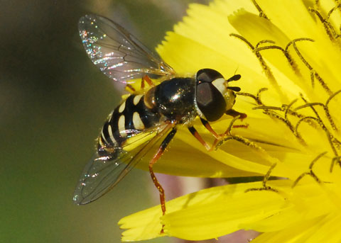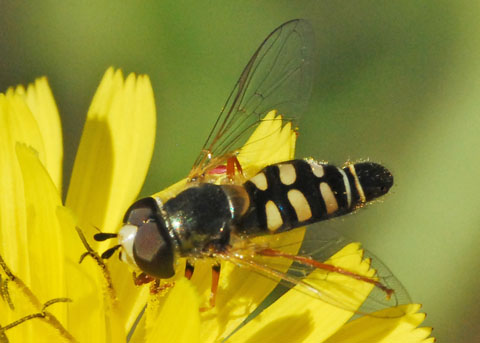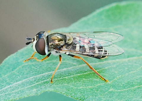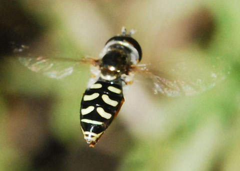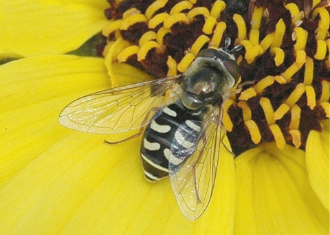 Eupeodes volucris This species: Broad ivory or white markings, none of which goes across the abdomen Diptera: Syrphidae