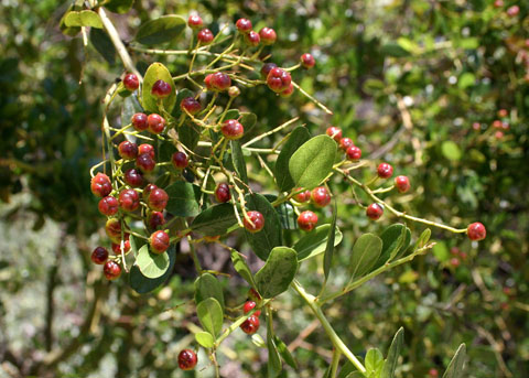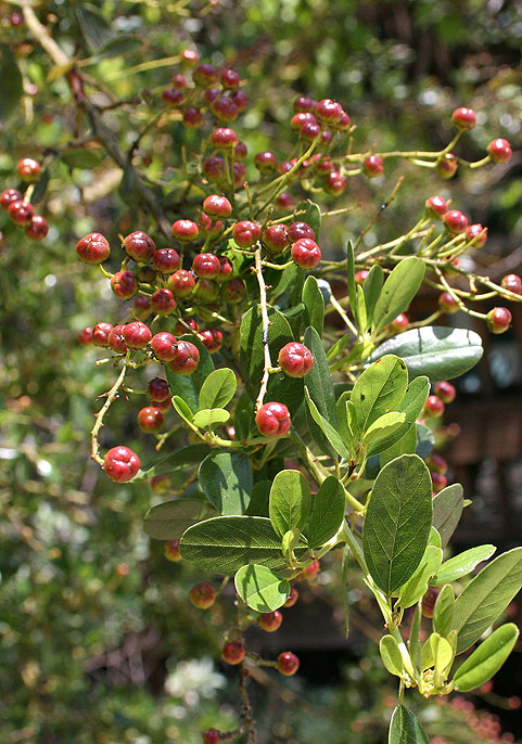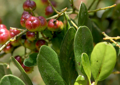 ![]() Leaves are alternate, evergreen, smooth-margined with notched apex, bright green and hairless above, lighter below, sometimes with stiff hairs on underside midrib. Cultivated at Thomas E. Riley Wilderness Park, Coto de Caza, Orange County, CA. 5-15-10. © Joan Avise. |